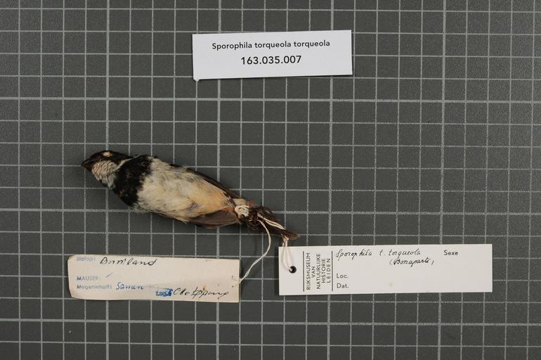 Keywords: Naturalis Biodiversity Center - RMNH.AVES.35078 2 - Sporophila torqueola torqueola (Bonaparte, 1851) - Emberizidae - bird skin specimen.jpeg artwork Dimensions artwork Document type Emberizidae Sporophila Individual count 1 Infraspecific epithet torqueola Infraspecific rank Institution Naturalis Kind of unit artwork Kind of unit specimen skin Life stage Oaxaca Loma Bonita Rancho Las Vegas Medium artwork Nomenclatural code Bodily condition Fett II Occurrence ID page Other fields Other versions artwork Permission license Naturalis donation CC-0 Publication location Scientific name Sporophila torqueola torqueola Bonaparte 1851 Scientific name authorship Bonaparte 1851 male Source url http //bioportal naturalis nl Specific epithet torqueola State or province Oaxaca Subject keywords artwork Subject keywords publication Title artwork Title publication Type status Uploaded with GWToolset Naturalis_Biodiversity_Center_-_RMNH AVES 35078_2_-_Sporophila_torqueola_torqueola_ Bonaparte _1851 _-_Emberizidae_-_bird_skin_specimen http //medialib naturalis nl/file/id/RMNH AVES 35078_2/format/large Media donated by Naturalis Biodiversity Center Songbird specimens at Naturalis Biodiversity Center Sporophila torqueola Sporophila |