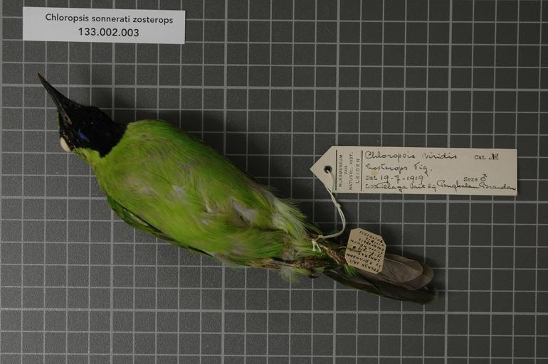 | Keywords: Naturalis Biodiversity Center - RMNH.AVES.127000 1 - Chloropsis sonnerati zosterops Vigors & Horsfield, 1830 - Irenidae - bird skin specimen.jpeg artwork Dimensions artwork Document type Irenidae Chloropsis Individual count 1 Infraspecific epithet zosterops Infraspecific rank Kind of unit artwork Kind of unit specimen skin Life stage Langkat Telaga Sait bij Pengkalan Brandan Medium artwork Nomenclatural code Locality remark On RMNH label Pengkalan Brandan Should probably be Pangkalanbrandan Occurrence ID Other fields Other versions artwork Permission license Naturalis donation CC-0 Publication location Scientific name Chloropsis sonnerati zosterops Vigors Horsfield 1830 Scientific name authorship Vigors Horsfield 1830 male Source url Specific epithet sonnerati State or province Langkat Subject keywords artwork Subject keywords publication Title artwork Title publication Type status Uploaded with GWToolset Naturalis_Biodiversity_Center_-_RMNH AVES 127000_1_-_Chloropsis_sonnerati_zosterops_Vigors_ _Horsfield _1830_-_Irenidae_-_bird_skin_specimen http //medialib naturalis nl/file/id/RMNH AVES 127000_1/format/large Media donated by Naturalis Biodiversity Center Songbird specimens at Naturalis Biodiversity Center Chloropsis sonnerati Chloropsis |