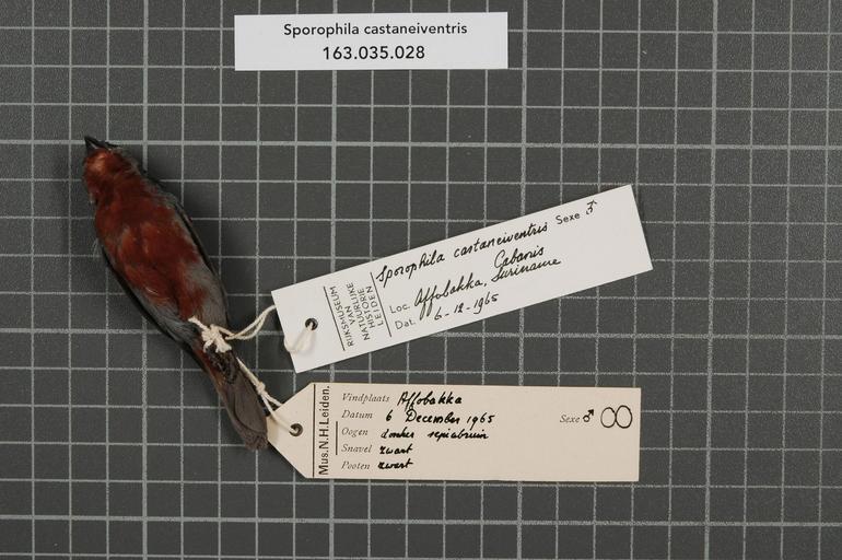 Keywords: Naturalis Biodiversity Center - RMNH.AVES.38190 2 - Sporophila castaneiventris Cabanis, 1849 - Emberizidae - bird skin specimen.jpeg artwork Dimensions artwork Document type Emberizidae Sporophila Individual count 1 Infraspecific epithet Infraspecific rank Institution Naturalis Kind of unit artwork Kind of unit specimen skin Life stage Suriname Affobakka Medium artwork Nomenclatural code Occurrence ID page Other fields Other versions artwork Permission license Naturalis donation CC-0 Publication location Scientific name Sporophila castaneiventris Cabanis 1849 Scientific name authorship Cabanis 1849 male Source url http //bioportal naturalis nl Specific epithet castaneiventris State or province Subject keywords artwork Subject keywords publication Title artwork Title publication Type status Uploaded with GWToolset Naturalis_Biodiversity_Center_-_RMNH AVES 38190_2_-_Sporophila_castaneiventris_Cabanis _1849_-_Emberizidae_-_bird_skin_specimen http //medialib naturalis nl/file/id/RMNH AVES 38190_2/format/large Media donated by Naturalis Biodiversity Center Songbird specimens at Naturalis Biodiversity Center Sporophila castaneiventris Sporophila |
