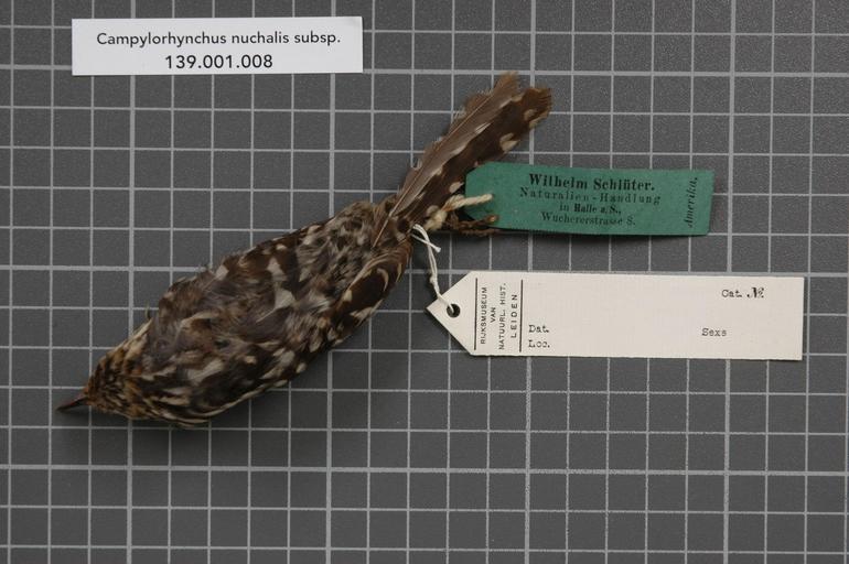| Keywords: Naturalis Biodiversity Center - RMNH.AVES.128590 1 - Campylorhynchus nuchalis subsp. - Troglodytidae - bird skin specimen.jpeg artwork Dimensions artwork Document type Troglodytidae Campylorhynchus Individual count 1 Infraspecific epithet subsp Infraspecific rank Institution Naturalis Kind of unit artwork Kind of unit specimen skin Life stage adult Medium artwork Nomenclatural code Occurrence ID page Other fields Other versions artwork Permission license Naturalis donation CC-0 Publication location Scientific name Campylorhynchus nuchalis subsp Scientific name authorship Source url http //bioportal naturalis nl Specific epithet nuchalis State or province Subject keywords artwork Subject keywords publication Title artwork Title publication Type status Uploaded with GWToolset Naturalis_Biodiversity_Center_-_RMNH AVES 128590_1_-_Campylorhynchus_nuchalis_subsp _-_Troglodytidae_-_bird_skin_specimen http //medialib naturalis nl/file/id/RMNH AVES 128590_1/format/large Media donated by Naturalis Biodiversity Center Songbird specimens at Naturalis Biodiversity Center Campylorhynchus nuchalis Campylorhynchus |