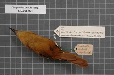 | Keywords: Naturalis Biodiversity Center - RMNH.AVES.128603 2 - Cinnycerthia unirufa subsp. - Troglodytidae - bird skin specimen.jpeg artwork Dimensions artwork Document type Troglodytidae Cinnycerthia Individual count 1 Infraspecific epithet subsp Infraspecific rank Institution Naturalis Kind of unit artwork Kind of unit specimen skin Life stage Medium artwork Nomenclatural code Country remark Ecuador crossed out on original label Sex remark Crossed out on original label Occurrence ID page Other fields Other versions artwork Permission license Naturalis donation CC-0 Publication location Scientific name Cinnycerthia unirufa subsp Scientific name authorship male Source url http //bioportal naturalis nl Specific epithet unirufa State or province Subject keywords artwork Subject keywords publication Title artwork Title publication Type status Uploaded with GWToolset Naturalis_Biodiversity_Center_-_RMNH AVES 128603_2_-_Cinnycerthia_unirufa_subsp _-_Troglodytidae_-_bird_skin_specimen http //medialib naturalis nl/file/id/RMNH AVES 128603_2/format/large Media donated by Naturalis Biodiversity Center Songbird specimens at Naturalis Biodiversity Center Cinnycerthia unirufa Cinnycerthia |