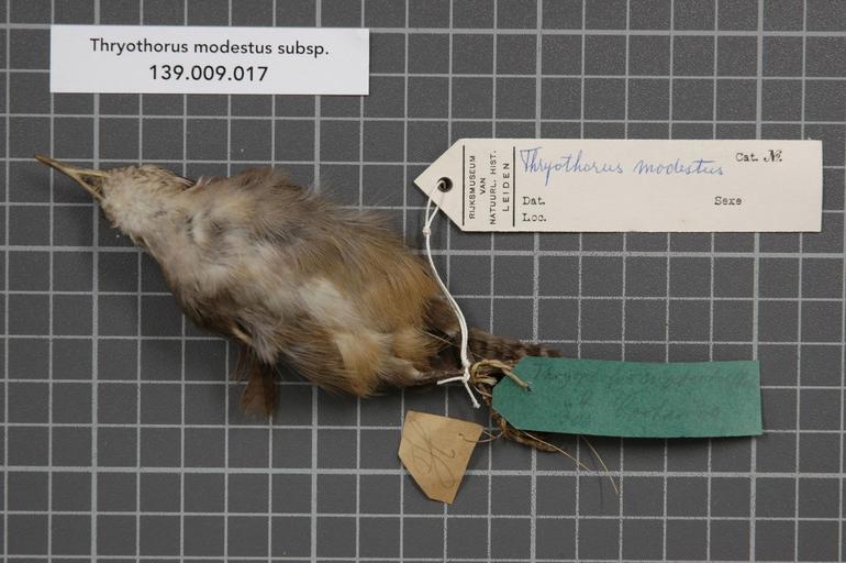 | Keywords: Naturalis Biodiversity Center - RMNH.AVES.128629 1 - Thryothorus modestus subsp. - Troglodytidae - bird skin specimen.jpeg artwork Dimensions artwork Document type Troglodytidae Thryothorus Individual count 1 Infraspecific epithet subsp Infraspecific rank Institution Naturalis Kind of unit artwork Kind of unit specimen skin Life stage Medium artwork Nomenclatural code Additional info H Country remark On Schlüter label Amerika Sex remark On Schlüter label female Occurrence ID page Other fields Other versions artwork Permission license Naturalis donation CC-0 Publication location Scientific name Thryothorus modestus subsp Scientific name authorship female Source url http //bioportal naturalis nl Specific epithet modestus State or province Subject keywords artwork Subject keywords publication Title artwork Title publication Type status Uploaded with GWToolset Naturalis_Biodiversity_Center_-_RMNH AVES 128629_1_-_Thryothorus_modestus_subsp _-_Troglodytidae_-_bird_skin_specimen http //medialib naturalis nl/file/id/RMNH AVES 128629_1/format/large Media donated by Naturalis Biodiversity Center Songbird specimens at Naturalis Biodiversity Center Thryothorus modestus Thryothorus |