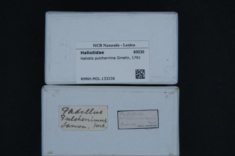 | Keywords: Naturalis Biodiversity Center - RMNH.MOL.133236 1 - Haliotis pulcherrima Gmelin, 1791 - Haliotidae - Mollusc shell.jpeg artwork Dimensions artwork Document type Haliotidae Haliotis Individual count Infraspecific epithet Infraspecific rank Institution Naturalis Kind of unit artwork Kind of unit specimen shell Life stage Medium artwork Nomenclatural code Source institute Leiden Scale the width of the text on the species/QR-code label is 38 mm Occurrence ID page Other fields Other versions artwork Permission license Naturalis donation CC-0 Mollusca Publication location Scientific name Haliotis pulcherrima Gmelin 1791 Scientific name authorship Gmelin 1791 Source url http //bioportal naturalis nl Specific epithet pulcherrima State or province Subject keywords artwork Subject keywords publication Title artwork Title publication Type status Uploaded with GWToolset Naturalis_Biodiversity_Center_-_RMNH MOL 133236_1_-_Haliotis_pulcherrima_Gmelin _1791_-_Haliotidae_-_Mollusc_shell http //medialib naturalis nl/file/id/RMNH MOL 133236_1/format/large Molluscs at Naturalis from the Rijksmuseum van Natuurlijke Historie Media donated by Naturalis Biodiversity Center Haliotis Haliotis pulcherrima |