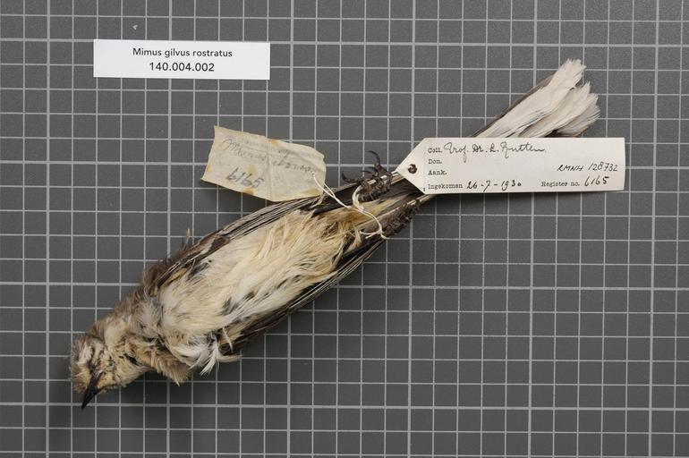 Keywords: Naturalis Biodiversity Center - RMNH.AVES.128732 2 - Mimus gilvus rostratus Ridgway, 1884 - Mimidae - bird skin specimen.jpeg artwork Dimensions artwork Document type Mimidae Mimus Individual count 1 Infraspecific epithet rostratus Infraspecific rank Institution Naturalis Kind of unit artwork Kind of unit specimen skin Life stage Medium artwork Nomenclatural code Region remark on field label Benedenwindsche-Eil Occurrence ID page Other fields Other versions artwork Permission license Naturalis donation CC-0 Publication location Scientific name Mimus gilvus rostratus Ridgway 1884 Scientific name authorship Ridgway 1884 male Source url http //bioportal naturalis nl Specific epithet gilvus State or province Subject keywords artwork Subject keywords publication Title artwork Title publication Type status Uploaded with GWToolset Naturalis_Biodiversity_Center_-_RMNH AVES 128732_2_-_Mimus_gilvus_rostratus_Ridgway _1884_-_Mimidae_-_bird_skin_specimen http //medialib naturalis nl/file/id/RMNH AVES 128732_2/format/large Media donated by Naturalis Biodiversity Center Songbird specimens at Naturalis Biodiversity Center Mimus gilvus museum specimens |