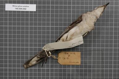 | Keywords: Naturalis Biodiversity Center - RMNH.AVES.128740 2 - Mimus gilvus antelius Oberholser, 1919 - Mimidae - bird skin specimen.jpeg artwork Dimensions artwork Document type Mimidae Mimus Individual count 1 Infraspecific epithet antelius Infraspecific rank Institution Naturalis Kind of unit artwork Kind of unit specimen skin Life stage Medium artwork Nomenclatural code Occurrence ID page Other fields Other versions artwork Permission license Naturalis donation CC-0 Publication location Scientific name Mimus gilvus antelius Oberholser 1919 Scientific name authorship Oberholser 1919 male Source url http //bioportal naturalis nl Specific epithet gilvus State or province Boa Vista Subject keywords artwork Subject keywords publication Title artwork Title publication Type status Uploaded with GWToolset Naturalis_Biodiversity_Center_-_RMNH AVES 128740_2_-_Mimus_gilvus_antelius_Oberholser _1919_-_Mimidae_-_bird_skin_specimen http //medialib naturalis nl/file/id/RMNH AVES 128740_2/format/large Media donated by Naturalis Biodiversity Center Songbird specimens at Naturalis Biodiversity Center Mimus gilvus museum specimens |