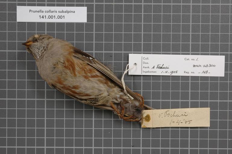| Keywords: Naturalis Biodiversity Center - RMNH.AVES.128800 2 - Prunella collaris subalpina (Brehm, 1831) - Prunellidae - bird skin specimen.jpeg artwork Dimensions artwork Document type Prunellidae Prunella Individual count 1 Infraspecific epithet subalpina Infraspecific rank Institution Naturalis Kind of unit artwork Kind of unit specimen skin Life stage adult Medium artwork Nomenclatural code Occurrence ID page Other fields Other versions artwork Permission license Naturalis donation CC-0 Publication location Scientific name Prunella collaris subalpina Brehm 1831 Scientific name authorship Brehm 1831 male Source url http //bioportal naturalis nl Specific epithet collaris State or province Dalmatiƫ Subject keywords artwork Subject keywords publication Title artwork Title publication Type status Uploaded with GWToolset Naturalis_Biodiversity_Center_-_RMNH AVES 128800_2_-_Prunella_collaris_subalpina_ Brehm _1831 _-_Prunellidae_-_bird_skin_specimen http //medialib naturalis nl/file/id/RMNH AVES 128800_2/format/large Media donated by Naturalis Biodiversity Center Songbird specimens at Naturalis Biodiversity Center Prunella collaris Prunella bird |