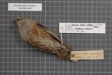 | Keywords: Naturalis Biodiversity Center - RMNH.AVES.128800 1 - Prunella collaris subalpina (Brehm, 1831) - Prunellidae - bird skin specimen.jpeg artwork Dimensions artwork Document type Prunellidae Prunella Individual count 1 Infraspecific epithet subalpina Infraspecific rank Institution Naturalis Kind of unit artwork Kind of unit specimen skin Life stage adult Medium artwork Nomenclatural code Occurrence ID page Other fields Other versions artwork Permission license Naturalis donation CC-0 Publication location Scientific name Prunella collaris subalpina Brehm 1831 Scientific name authorship Brehm 1831 male Source url http //bioportal naturalis nl Specific epithet collaris State or province Dalmatiƫ Subject keywords artwork Subject keywords publication Title artwork Title publication Type status Uploaded with GWToolset Naturalis_Biodiversity_Center_-_RMNH AVES 128800_1_-_Prunella_collaris_subalpina_ Brehm _1831 _-_Prunellidae_-_bird_skin_specimen http //medialib naturalis nl/file/id/RMNH AVES 128800_1/format/large Media donated by Naturalis Biodiversity Center Songbird specimens at Naturalis Biodiversity Center Prunella collaris Prunella bird |