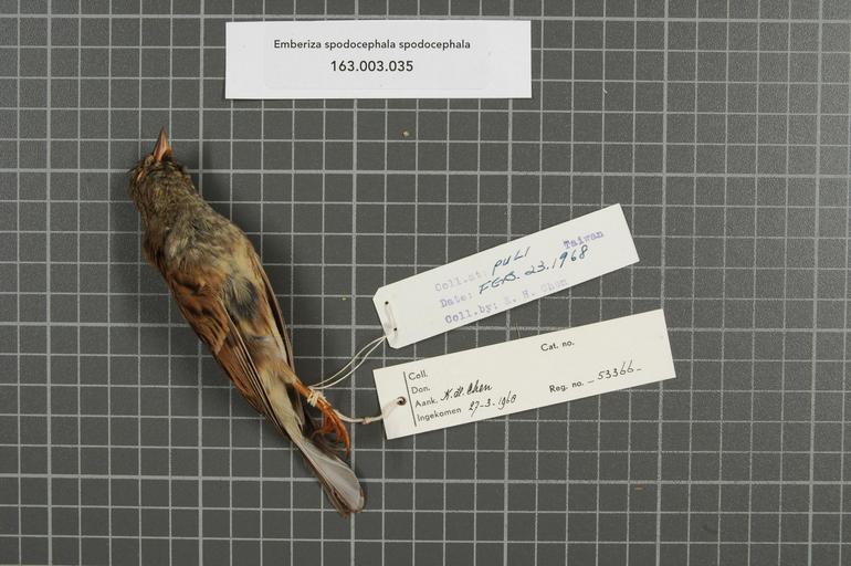| Keywords: Naturalis Biodiversity Center - RMNH.AVES.53366 1 - Emberiza spodocephala spodocephala Pallas, 1776 - Emberizidae - bird skin specimen.jpeg artwork Dimensions artwork Document type Emberizidae Emberiza Individual count 1 Infraspecific epithet spodocephala Infraspecific rank Institution Naturalis Kind of unit artwork Kind of unit specimen skin Life stage Taiwan Formosa Puli Medium artwork Nomenclatural code Sex remark on label female whipped out male GK Occurrence ID page Other fields Other versions artwork Permission license Naturalis donation CC-0 Publication location Scientific name Emberiza spodocephala spodocephala Pallas 1776 Scientific name authorship Pallas 1776 female Source url http //bioportal naturalis nl Specific epithet spodocephala State or province Subject keywords artwork Subject keywords publication Title artwork Title publication Type status Uploaded with GWToolset Naturalis_Biodiversity_Center_-_RMNH AVES 53366_1_-_Emberiza_spodocephala_spodocephala_Pallas _1776_-_Emberizidae_-_bird_skin_specimen http //medialib naturalis nl/file/id/RMNH AVES 53366_1/format/large Media donated by Naturalis Biodiversity Center Songbird specimens at Naturalis Biodiversity Center Emberiza spodocephala Emberiza |