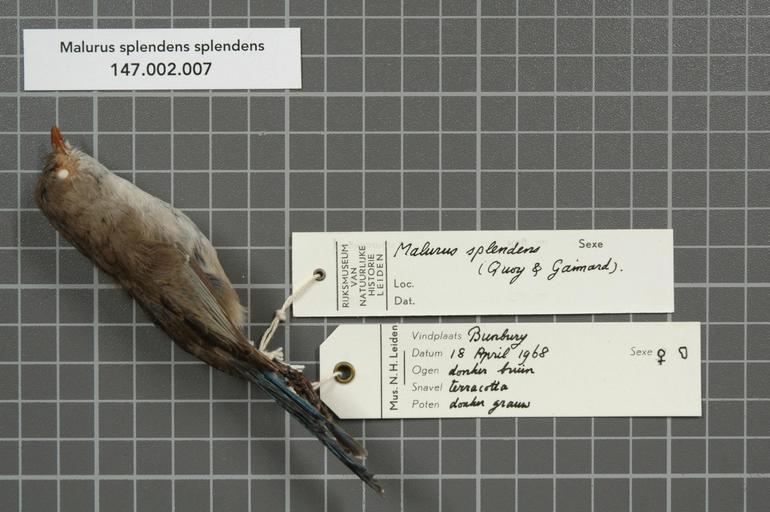 | Keywords: Naturalis Biodiversity Center - RMNH.AVES.54287 1 - Malurus splendens splendens (Quoy & Gaimard, 1830) - Maluridae - bird skin specimen.jpeg artwork Dimensions artwork Document type Maluridae Malurus Individual count 1 Infraspecific epithet splendens Infraspecific rank Institution Naturalis Kind of unit artwork Kind of unit specimen skin Life stage W Australiƫ Bunbury Medium artwork Nomenclatural code Occurrence ID page Other fields Other versions artwork Permission license Naturalis donation CC-0 Publication location Scientific name Malurus splendens splendens Quoy Gaimard 1830 Scientific name authorship Quoy Gaimard 1830 female Source url http //bioportal naturalis nl Specific epithet splendens State or province W Australiƫ Subject keywords artwork Subject keywords publication Title artwork Title publication Type status Uploaded with GWToolset Naturalis_Biodiversity_Center_-_RMNH AVES 54287_1_-_Malurus_splendens_splendens_ Quoy_ _Gaimard _1830 _-_Maluridae_-_bird_skin_specimen http //medialib naturalis nl/file/id/RMNH AVES 54287_1/format/large Media donated by Naturalis Biodiversity Center Songbird specimens at Naturalis Biodiversity Center Malurus splendens Malurus |