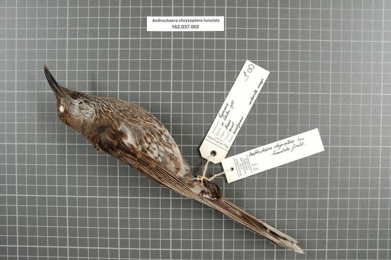 | Keywords: Naturalis Biodiversity Center - RMNH.AVES.54926 1 - Anthochaera chrysoptera lunulata (Gould, 1838) - Meliphagidae - bird skin specimen.jpeg artwork Dimensions artwork Document type Meliphagidae Anthochaera Individual count 1 Infraspecific epithet lunulata Infraspecific rank Institution Naturalis Kind of unit artwork Kind of unit specimen skin Life stage W Australiƫ Esperance Medium artwork Nomenclatural code Occurrence ID page Other fields Other versions artwork Permission license Naturalis donation CC-0 Publication location Scientific name Anthochaera chrysoptera lunulata Gould 1838 Scientific name authorship Gould 1838 male Source url http //bioportal naturalis nl Specific epithet chrysoptera State or province W Australiƫ Subject keywords artwork Subject keywords publication Title artwork Title publication Type status Uploaded with GWToolset Naturalis_Biodiversity_Center_-_RMNH AVES 54926_1_-_Anthochaera_chrysoptera_lunulata_ Gould _1838 _-_Meliphagidae_-_bird_skin_specimen http //medialib naturalis nl/file/id/RMNH AVES 54926_1/format/large Media donated by Naturalis Biodiversity Center Songbird specimens at Naturalis Biodiversity Center Anthochaera chrysoptera Anthochaera |