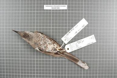 | Keywords: Naturalis Biodiversity Center - RMNH.AVES.54927 2 - Anthochaera chrysoptera lunulata (Gould, 1838) - Meliphagidae - bird skin specimen.jpeg artwork Dimensions artwork Document type Meliphagidae Anthochaera Individual count 1 Infraspecific epithet lunulata Infraspecific rank Institution Naturalis Kind of unit artwork Kind of unit specimen skin Life stage W Australiƫ Esperance Medium artwork Nomenclatural code Occurrence ID page Other fields Other versions artwork Permission license Naturalis donation CC-0 Publication location Scientific name Anthochaera chrysoptera lunulata Gould 1838 Scientific name authorship Gould 1838 female Source url http //bioportal naturalis nl Specific epithet chrysoptera State or province W Australiƫ Subject keywords artwork Subject keywords publication Title artwork Title publication Type status Uploaded with GWToolset Naturalis_Biodiversity_Center_-_RMNH AVES 54927_2_-_Anthochaera_chrysoptera_lunulata_ Gould _1838 _-_Meliphagidae_-_bird_skin_specimen http //medialib naturalis nl/file/id/RMNH AVES 54927_2/format/large Media donated by Naturalis Biodiversity Center Songbird specimens at Naturalis Biodiversity Center Anthochaera chrysoptera Anthochaera |