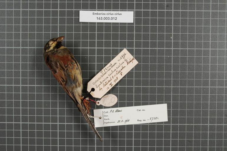Keywords: Naturalis Biodiversity Center - RMNH.AVES.57321 1 - Emberiza cirlus cirlus Linnaeus, 1766 - Emberizidae - bird skin specimen.jpeg artwork Dimensions artwork Document type Emberizidae Emberiza Individual count 1 Infraspecific epithet cirlus Infraspecific rank Institution Naturalis Kind of unit artwork Kind of unit specimen skin Life stage Portugal Z v Lissabon bij Setubal Medium artwork Nomenclatural code Occurrence ID page Other fields Other versions artwork Permission license Naturalis donation CC-0 Publication location Scientific name Emberiza cirlus cirlus Linnaeus 1766 Scientific name authorship Linnaeus 1766 male Source url http //bioportal naturalis nl Specific epithet cirlus State or province Subject keywords artwork Subject keywords publication Title artwork Title publication Type status Uploaded with GWToolset Naturalis_Biodiversity_Center_-_RMNH AVES 57321_1_-_Emberiza_cirlus_cirlus_Linnaeus _1766_-_Emberizidae_-_bird_skin_specimen http //medialib naturalis nl/file/id/RMNH AVES 57321_1/format/large Media donated by Naturalis Biodiversity Center Songbird specimens at Naturalis Biodiversity Center Emberiza cirlus Emberiza |