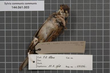 | Keywords: Naturalis Biodiversity Center - RMNH.AVES.58236 2 - Sylvia communis communis Latham, 1787 - Sylviidae - bird skin specimen.jpeg artwork Dimensions artwork Document type Sylviidae Sylvia Individual count 1 Infraspecific epithet communis Infraspecific rank Institution Naturalis Kind of unit artwork Kind of unit specimen skin Life stage Portugal bij Setubal Z v Lissabon Medium artwork Nomenclatural code Occurrence ID page Other fields Other versions artwork Permission license Naturalis donation CC-0 Publication location Scientific name Sylvia communis communis Latham 1787 Scientific name authorship Latham 1787 male Source url http //bioportal naturalis nl Specific epithet communis State or province Subject keywords artwork Subject keywords publication Title artwork Title publication Type status Uploaded with GWToolset Naturalis_Biodiversity_Center_-_RMNH AVES 58236_2_-_Sylvia_communis_communis_Latham _1787_-_Sylviidae_-_bird_skin_specimen http //medialib naturalis nl/file/id/RMNH AVES 58236_2/format/large Media donated by Naturalis Biodiversity Center Songbird specimens at Naturalis Biodiversity Center Sylvia communis Sylvia |
