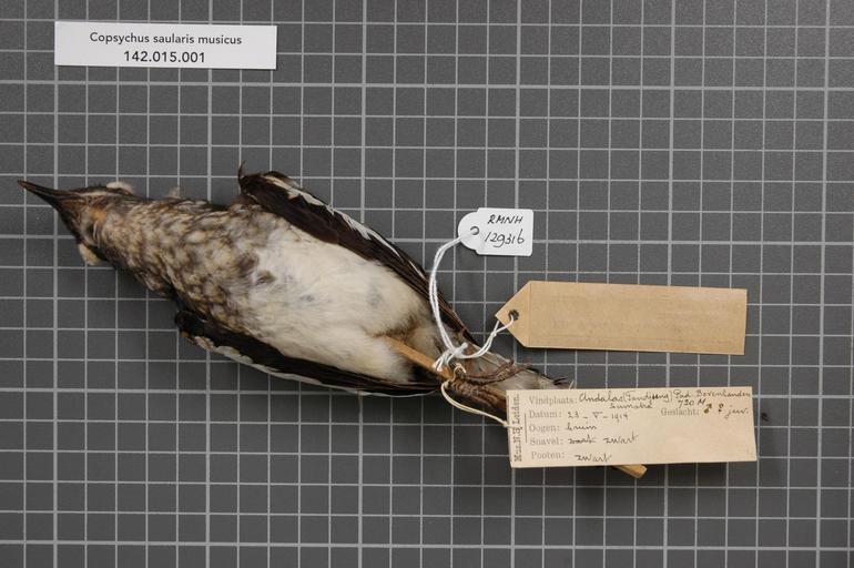 | Keywords: Naturalis Biodiversity Center - RMNH.AVES.129316 2 - Copsychus saularis musicus (Raffles, 1822) - Turdidae - bird skin specimen.jpeg artwork Dimensions artwork Document type Turdidae Copsychus Individual count 1 Infraspecific epithet musicus Infraspecific rank Institution Naturalis Kind of unit artwork Kind of unit specimen skin Life stage juvenile Medium artwork Nomenclatural code Sex remark On fieldlabel male Occurrence ID page Other fields Other versions artwork Permission license Naturalis donation CC-0 Publication location Scientific name Copsychus saularis musicus Raffles 1822 Scientific name authorship Raffles 1822 male Source url http //bioportal naturalis nl Specific epithet saularis State or province Sumatra Pad Bovenlanden Subject keywords artwork Subject keywords publication Title artwork Title publication Type status Uploaded with GWToolset Naturalis_Biodiversity_Center_-_RMNH AVES 129316_2_-_Copsychus_saularis_musicus_ Raffles _1822 _-_Turdidae_-_bird_skin_specimen http //medialib naturalis nl/file/id/RMNH AVES 129316_2/format/large Media donated by Naturalis Biodiversity Center Songbird specimens at Naturalis Biodiversity Center Copsychus saularis museum specimens |