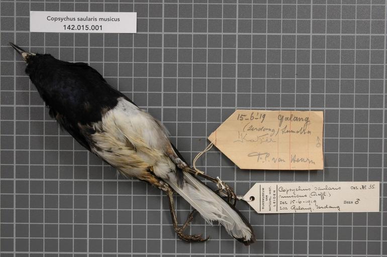 | Keywords: Naturalis Biodiversity Center - RMNH.AVES.129324 1 - Copsychus saularis musicus (Raffles, 1822) - Turdidae - bird skin specimen.jpeg artwork Dimensions artwork Document type Turdidae Copsychus Individual count 1 Infraspecific epithet musicus Infraspecific rank Institution Naturalis Kind of unit artwork Kind of unit specimen skin Life stage Medium artwork Nomenclatural code Occurrence ID page Other fields Other versions artwork Permission license Naturalis donation CC-0 Publication location Scientific name Copsychus saularis musicus Raffles 1822 Scientific name authorship Raffles 1822 male Source url http //bioportal naturalis nl Specific epithet saularis State or province Sumatra Serdang Subject keywords artwork Subject keywords publication Title artwork Title publication Type status Uploaded with GWToolset Naturalis_Biodiversity_Center_-_RMNH AVES 129324_1_-_Copsychus_saularis_musicus_ Raffles _1822 _-_Turdidae_-_bird_skin_specimen http //medialib naturalis nl/file/id/RMNH AVES 129324_1/format/large Media donated by Naturalis Biodiversity Center Songbird specimens at Naturalis Biodiversity Center Copsychus saularis museum specimens |