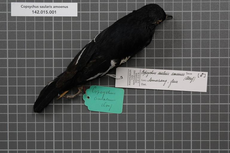 | Keywords: Naturalis Biodiversity Center - RMNH.AVES.129411 1 - Copsychus saularis amoenus (Horsfield, 1821) - Turdidae - bird skin specimen.jpeg artwork Dimensions artwork Document type Turdidae Copsychus Individual count 1 Infraspecific epithet amoenus Infraspecific rank Institution Naturalis Kind of unit artwork Kind of unit specimen skin Life stage Medium artwork Nomenclatural code Sex remark Vorderman label no information about the SexRMNH label male Occurrence ID page Other fields Other versions artwork Permission license Naturalis donation CC-0 Publication location Scientific name Copsychus saularis amoenus Horsfield 1821 Scientific name authorship Horsfield 1821 male Source url http //bioportal naturalis nl Specific epithet saularis State or province Java Semarang Subject keywords artwork Subject keywords publication Title artwork Title publication Type status Uploaded with GWToolset Naturalis_Biodiversity_Center_-_RMNH AVES 129411_1_-_Copsychus_saularis_amoenus_ Horsfield _1821 _-_Turdidae_-_bird_skin_specimen http //medialib naturalis nl/file/id/RMNH AVES 129411_1/format/large Media donated by Naturalis Biodiversity Center Songbird specimens at Naturalis Biodiversity Center Copsychus saularis museum specimens |