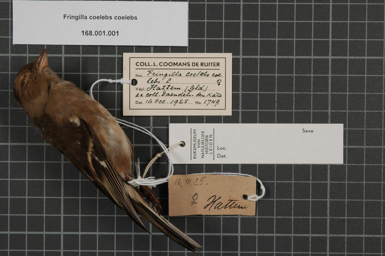 | Keywords: Naturalis Biodiversity Center - RMNH.AVES.60698 1 - Fringilla coelebs coelebs Linnaeus, 1758 - Fringillidae - bird skin specimen.jpeg artwork Dimensions artwork Document type Fringillidae Fringilla Individual count 1 Infraspecific epithet coelebs Infraspecific rank Institution Naturalis Kind of unit artwork Kind of unit specimen skin Life stage Netherlands Gelderland Hattem Medium artwork Nomenclatural code Region remark On Coomans label Gld Occurrence ID page Other fields Other versions artwork Permission license Naturalis donation CC-0 Publication location Scientific name Fringilla coelebs coelebs Linnaeus 1758 Scientific name authorship Linnaeus 1758 female Source url http //bioportal naturalis nl Specific epithet coelebs State or province Gelderland Subject keywords artwork Subject keywords publication Title artwork Title publication Type status Uploaded with GWToolset Naturalis_Biodiversity_Center_-_RMNH AVES 60698_1_-_Fringilla_coelebs_coelebs_Linnaeus _1758_-_Fringillidae_-_bird_skin_specimen http //medialib naturalis nl/file/id/RMNH AVES 60698_1/format/large Media donated by Naturalis Biodiversity Center Songbird specimens at Naturalis Biodiversity Center Fringilla coelebs Fringilla |