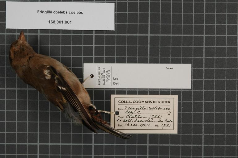 | Keywords: Naturalis Biodiversity Center - RMNH.AVES.60699 1 - Fringilla coelebs coelebs Linnaeus, 1758 - Fringillidae - bird skin specimen.jpeg artwork Dimensions artwork Document type Fringillidae Fringilla Individual count 1 Infraspecific epithet coelebs Infraspecific rank Institution Naturalis Kind of unit artwork Kind of unit specimen skin Life stage Netherlands Gelderland Hattem Medium artwork Nomenclatural code Region remark On Coomans label Gld Occurrence ID page Other fields Other versions artwork Permission license Naturalis donation CC-0 Publication location Scientific name Fringilla coelebs coelebs Linnaeus 1758 Scientific name authorship Linnaeus 1758 female Source url http //bioportal naturalis nl Specific epithet coelebs State or province Gelderland Subject keywords artwork Subject keywords publication Title artwork Title publication Type status Uploaded with GWToolset Naturalis_Biodiversity_Center_-_RMNH AVES 60699_1_-_Fringilla_coelebs_coelebs_Linnaeus _1758_-_Fringillidae_-_bird_skin_specimen http //medialib naturalis nl/file/id/RMNH AVES 60699_1/format/large Media donated by Naturalis Biodiversity Center Songbird specimens at Naturalis Biodiversity Center Fringilla coelebs Fringilla |