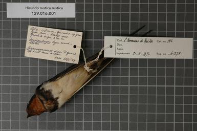 | Keywords: Naturalis Biodiversity Center - RMNH.AVES.61278 2 - Hirundo rustica rustica Linnaeus, 1758 - Hirundinidae - bird skin specimen.jpeg artwork Dimensions artwork Document type Hirundinidae Hirundo Individual count 1 Infraspecific epithet rustica Infraspecific rank Institution Naturalis Kind of unit artwork Kind of unit specimen skin Life stage Zeeland Renesse Schouwen Medium artwork Nomenclatural code Bodily condition beetj vet ADDITIONAL preparation info Gepraepareerd door P Graat v/h Zool mus a'dam Occurrence ID page Other fields Other versions artwork Permission license Naturalis donation CC-0 Publication location Scientific name Hirundo rustica rustica Linnaeus 1758 Scientific name authorship Linnaeus 1758 female Source url http //bioportal naturalis nl Specific epithet rustica State or province Zeeland Subject keywords artwork Subject keywords publication Title artwork Title publication Type status Uploaded with GWToolset Naturalis_Biodiversity_Center_-_RMNH AVES 61278_2_-_Hirundo_rustica_rustica_Linnaeus _1758_-_Hirundinidae_-_bird_skin_specimen http //medialib naturalis nl/file/id/RMNH AVES 61278_2/format/large Media donated by Naturalis Biodiversity Center Songbird specimens at Naturalis Biodiversity Center Hirundo rustica Hirundo |