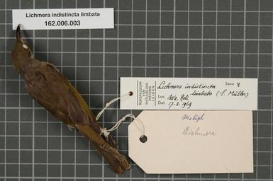 | Keywords: Naturalis Biodiversity Center - RMNH.AVES.65544 1 - Lichmera indistincta limbata (S. Muller, 1843) - Meliphagidae - bird skin specimen.jpeg artwork Dimensions artwork Document type Meliphagidae Lichmera Individual count 1 Infraspecific epithet limbata Infraspecific rank Institution Naturalis Kind of unit artwork Kind of unit specimen skin Life stage Roti Ba'a Medium artwork Nomenclatural code Occurrence ID page Other fields Other versions artwork Permission license Naturalis donation CC-0 Publication location Scientific name Lichmera indistincta limbata S Muller 1843 Scientific name authorship S Müller 1843 female Source url http //bioportal naturalis nl Specific epithet indistincta State or province Roti Subject keywords artwork Subject keywords publication Title artwork Title publication Type status Uploaded with GWToolset Naturalis_Biodiversity_Center_-_RMNH AVES 65544_1_-_Lichmera_indistincta_limbata_ S _Muller _1843 _-_Meliphagidae_-_bird_skin_specimen http //medialib naturalis nl/file/id/RMNH AVES 65544_1/format/large Media donated by Naturalis Biodiversity Center Songbird specimens at Naturalis Biodiversity Center Lichmera indistincta Lichmera |