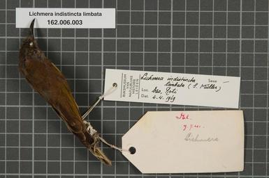 | Keywords: Naturalis Biodiversity Center - RMNH.AVES.65551 1 - Lichmera indistincta limbata (S. Muller, 1843) - Meliphagidae - bird skin specimen.jpeg artwork Dimensions artwork Document type Meliphagidae Lichmera Individual count 1 Infraspecific epithet limbata Infraspecific rank Institution Naturalis Kind of unit artwork Kind of unit specimen skin Life stage Roti Dao Medium artwork Nomenclatural code ADDITIONAL info XXX Sex remark On RMNH label -On original label s i Occurrence ID page Other fields Other versions artwork Permission license Naturalis donation CC-0 Publication location Scientific name Lichmera indistincta limbata S Muller 1843 Scientific name authorship S Müller 1843 Source url http //bioportal naturalis nl Specific epithet indistincta State or province Roti Subject keywords artwork Subject keywords publication Title artwork Title publication Type status Uploaded with GWToolset Naturalis_Biodiversity_Center_-_RMNH AVES 65551_1_-_Lichmera_indistincta_limbata_ S _Muller _1843 _-_Meliphagidae_-_bird_skin_specimen http //medialib naturalis nl/file/id/RMNH AVES 65551_1/format/large Media donated by Naturalis Biodiversity Center Songbird specimens at Naturalis Biodiversity Center Lichmera indistincta Lichmera |