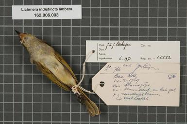 | Keywords: Naturalis Biodiversity Center - RMNH.AVES.65553 2 - Lichmera indistincta limbata (S. Muller, 1843) - Meliphagidae - bird skin specimen.jpeg artwork Dimensions artwork Document type Meliphagidae Lichmera Individual count 1 Infraspecific epithet limbata Infraspecific rank Institution Naturalis Kind of unit artwork Kind of unit specimen skin Life stage Roti Ba'a Medium artwork Nomenclatural code Occurrence ID page Other fields Other versions artwork Permission license Naturalis donation CC-0 Publication location Scientific name Lichmera indistincta limbata S Muller 1843 Scientific name authorship S Müller 1843 female Source url http //bioportal naturalis nl Specific epithet indistincta State or province Roti Subject keywords artwork Subject keywords publication Title artwork Title publication Type status Uploaded with GWToolset Naturalis_Biodiversity_Center_-_RMNH AVES 65553_2_-_Lichmera_indistincta_limbata_ S _Muller _1843 _-_Meliphagidae_-_bird_skin_specimen http //medialib naturalis nl/file/id/RMNH AVES 65553_2/format/large Media donated by Naturalis Biodiversity Center Songbird specimens at Naturalis Biodiversity Center Lichmera indistincta Lichmera |