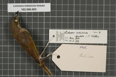 | Keywords: Naturalis Biodiversity Center - RMNH.AVES.65553 1 - Lichmera indistincta limbata (S. Muller, 1843) - Meliphagidae - bird skin specimen.jpeg artwork Dimensions artwork Document type Meliphagidae Lichmera Individual count 1 Infraspecific epithet limbata Infraspecific rank Institution Naturalis Kind of unit artwork Kind of unit specimen skin Life stage Roti Ba'a Medium artwork Nomenclatural code Occurrence ID page Other fields Other versions artwork Permission license Naturalis donation CC-0 Publication location Scientific name Lichmera indistincta limbata S Muller 1843 Scientific name authorship S Müller 1843 female Source url http //bioportal naturalis nl Specific epithet indistincta State or province Roti Subject keywords artwork Subject keywords publication Title artwork Title publication Type status Uploaded with GWToolset Naturalis_Biodiversity_Center_-_RMNH AVES 65553_1_-_Lichmera_indistincta_limbata_ S _Muller _1843 _-_Meliphagidae_-_bird_skin_specimen http //medialib naturalis nl/file/id/RMNH AVES 65553_1/format/large Media donated by Naturalis Biodiversity Center Songbird specimens at Naturalis Biodiversity Center Lichmera indistincta Lichmera |
