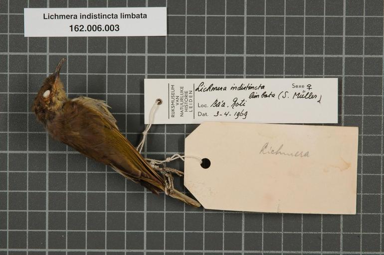 | Keywords: Naturalis Biodiversity Center - RMNH.AVES.65558 1 - Lichmera indistincta limbata (S. Muller, 1843) - Meliphagidae - bird skin specimen.jpeg  artwork Dimensions artwork Document type Meliphagidae Lichmera Individual count 1 Infraspecific epithet limbata Infraspecific rank Institution Naturalis Kind of unit artwork Kind of unit specimen skin Life stage Roti Ba'a Medium artwork Nomenclatural code Occurrence ID page Other fields Other versions artwork Permission license Naturalis donation CC-0 Publication location Scientific name Lichmera indistincta limbata S Muller 1843 Scientific name authorship S Müller 1843 female Source url http //bioportal naturalis nl Specific epithet indistincta State or province Roti Subject keywords artwork Subject keywords publication Title artwork Title publication Type status Uploaded with GWToolset Naturalis_Biodiversity_Center_-_RMNH AVES 65558_1_-_Lichmera_indistincta_limbata_ S _Muller _1843 _-_Meliphagidae_-_bird_skin_specimen http //medialib naturalis nl/file/id/RMNH AVES 65558_1/format/large Media donated by Naturalis Biodiversity Center Songbird specimens at Naturalis Biodiversity Center Lichmera indistincta Lichmera |