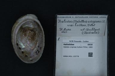 | Keywords: Naturalis Biodiversity Center - RMNH.MOL.133778 - Haliotis virginea huttoni Filhol, 1880 - Haliotidae - Mollusc shell.jpeg artwork Dimensions artwork Document type Haliotidae Haliotis Individual count Infraspecific epithet Infraspecific rank Institution Naturalis Kind of unit artwork Kind of unit specimen shell Life stage Medium artwork Nomenclatural code Source institute Leiden Scale the width of the text on the species/QR-code label is 38 mm Occurrence ID page Other fields Other versions artwork Permission license Naturalis donation CC-0 Mollusca Publication location Scientific name Haliotis virginea huttoni Filhol 1880 Scientific name authorship Filhol 1880 Source url http //bioportal naturalis nl Specific epithet virginea huttoni State or province Subject keywords artwork Subject keywords publication Title artwork Title publication Type status Uploaded with GWToolset Naturalis_Biodiversity_Center_-_RMNH MOL 133778_-_Haliotis_virginea_huttoni_Filhol _1880_-_Haliotidae_-_Mollusc_shell http //medialib naturalis nl/file/id/RMNH MOL 133778/format/large Molluscs at Naturalis from the Rijksmuseum van Natuurlijke Historie Media donated by Naturalis Biodiversity Center Haliotis Haliotis virginea huttoni |