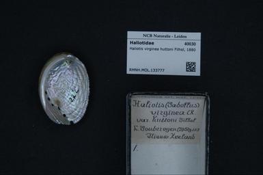 | Keywords: Naturalis Biodiversity Center - RMNH.MOL.133777 - Haliotis virginea huttoni Filhol, 1880 - Haliotidae - Mollusc shell.jpeg artwork Dimensions artwork Document type Haliotidae Haliotis Individual count Infraspecific epithet Infraspecific rank Institution Naturalis Kind of unit artwork Kind of unit specimen shell Life stage Medium artwork Nomenclatural code Source institute Leiden Scale the width of the text on the species/QR-code label is 38 mm Occurrence ID page Other fields Other versions artwork Permission license Naturalis donation CC-0 Mollusca Publication location Scientific name Haliotis virginea huttoni Filhol 1880 Scientific name authorship Filhol 1880 Source url http //bioportal naturalis nl Specific epithet virginea huttoni State or province Subject keywords artwork Subject keywords publication Title artwork Title publication Type status Uploaded with GWToolset Naturalis_Biodiversity_Center_-_RMNH MOL 133777_-_Haliotis_virginea_huttoni_Filhol _1880_-_Haliotidae_-_Mollusc_shell http //medialib naturalis nl/file/id/RMNH MOL 133777/format/large Molluscs at Naturalis from the Rijksmuseum van Natuurlijke Historie Media donated by Naturalis Biodiversity Center Haliotis Haliotis virginea huttoni |