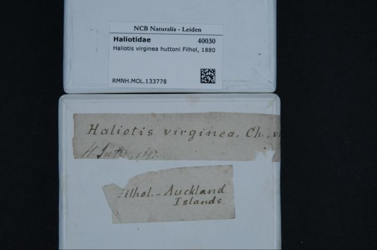 | Keywords: Naturalis Biodiversity Center - RMNH.MOL.133778 1 - Haliotis virginea huttoni Filhol, 1880 - Haliotidae - Mollusc shell.jpeg artwork Dimensions artwork Document type Haliotidae Haliotis Individual count Infraspecific epithet Infraspecific rank Institution Naturalis Kind of unit artwork Kind of unit specimen shell Life stage Medium artwork Nomenclatural code Source institute Leiden Scale the width of the text on the species/QR-code label is 38 mm Occurrence ID page Other fields Other versions artwork Permission license Naturalis donation CC-0 Mollusca Publication location Scientific name Haliotis virginea huttoni Filhol 1880 Scientific name authorship Filhol 1880 Source url http //bioportal naturalis nl Specific epithet virginea huttoni State or province Subject keywords artwork Subject keywords publication Title artwork Title publication Type status Uploaded with GWToolset Naturalis_Biodiversity_Center_-_RMNH MOL 133778_1_-_Haliotis_virginea_huttoni_Filhol _1880_-_Haliotidae_-_Mollusc_shell http //medialib naturalis nl/file/id/RMNH MOL 133778_1/format/large Molluscs at Naturalis from the Rijksmuseum van Natuurlijke Historie Media donated by Naturalis Biodiversity Center Haliotis Haliotis virginea huttoni |