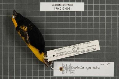 | Keywords: Naturalis Biodiversity Center - RMNH.AVES.86175 1 - Euplectes afer taha A. Smith, 1836 - Ploceidae - bird skin specimen.jpeg artwork Dimensions artwork Document type Ploceidae Euplectes Individual count 1 Infraspecific epithet taha Infraspecific rank Institution Naturalis Kind of unit artwork Kind of unit specimen skin Life stage adult South Africa Natal Klip River Ladysmith Medium artwork Nomenclatural code Occurrence ID page Other fields Other versions artwork Permission license Naturalis donation CC-0 Publication location Scientific name Euplectes afer taha A Smith 1836 Scientific name authorship A Smith 1836 male Source url http //bioportal naturalis nl Specific epithet afer State or province Natal Subject keywords artwork Subject keywords publication Title artwork Title publication Type status Uploaded with GWToolset Naturalis_Biodiversity_Center_-_RMNH AVES 86175_1_-_Euplectes_afer_taha_A _Smith _1836_-_Ploceidae_-_bird_skin_specimen http //medialib naturalis nl/file/id/RMNH AVES 86175_1/format/large Media donated by Naturalis Biodiversity Center Songbird specimens at Naturalis Biodiversity Center Euplectes afer |