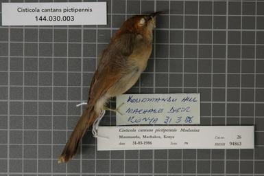 | Keywords: Naturalis Biodiversity Center - RMNH.AVES.94863 1 - Cisticola cantans pictipennis Madarász, 1904 - Sylviidae - bird skin specimen.jpeg artwork Dimensions artwork Document type Sylviidae Cisticola Individual count 1 Infraspecific epithet pictipennis Infraspecific rank Institution Naturalis Kind of unit artwork Kind of unit specimen skin Life stage Kenya Machakos distr Muumandu Hill Medium artwork Nomenclatural code ADDITIONAL info remark on field label female ONEon label RMNH m Sex remark on field label female ONEon label RMNH m Occurrence ID page Other fields Other versions artwork Permission license Naturalis donation CC-0 Publication location Scientific name Cisticola cantans pictipennis Madarász 1904 Scientific name authorship Madarász 1904 male Source url http //bioportal naturalis nl Specific epithet cantans State or province Machakos distr Subject keywords artwork Subject keywords publication Title artwork Title publication Type status Uploaded with GWToolset Naturalis_Biodiversity_Center_-_RMNH AVES 94863_1_-_Cisticola_cantans_pictipennis_Madarász _1904_-_Sylviidae_-_bird_skin_specimen http //medialib naturalis nl/file/id/RMNH AVES 94863_1/format/large Media donated by Naturalis Biodiversity Center Songbird specimens at Naturalis Biodiversity Center Cisticola cantans museum specimens |