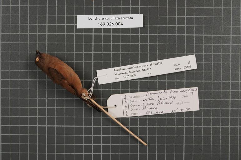 Keywords: Naturalis Biodiversity Center - RMNH.AVES.93256 1 - Lonchura cucullata scutata (Heuglin, 1863) - Estrildidae - bird skin specimen.jpeg artwork Dimensions artwork Document type Estrildidae Lonchura Individual count 1 Infraspecific epithet scutata Infraspecific rank Institution Naturalis Kind of unit artwork Kind of unit specimen skin Life stage Kenya Machakos Muumandu Medium artwork Nomenclatural code Sex remark on original label Sexe Occurrence ID page Other fields Other versions artwork Permission license Naturalis donation CC-0 Publication location Scientific name Lonchura cucullata scutata Heuglin 1863 Scientific name authorship Heuglin 1863 Source url http //bioportal naturalis nl Specific epithet cucullata State or province Machakos Subject keywords artwork Subject keywords publication Title artwork Title publication Type status Uploaded with GWToolset Naturalis_Biodiversity_Center_-_RMNH AVES 93256_1_-_Lonchura_cucullata_scutata_ Heuglin _1863 _-_Estrildidae_-_bird_skin_specimen http //medialib naturalis nl/file/id/RMNH AVES 93256_1/format/large Media donated by Naturalis Biodiversity Center Songbird specimens at Naturalis Biodiversity Center Lonchura cucullata museum specimens |