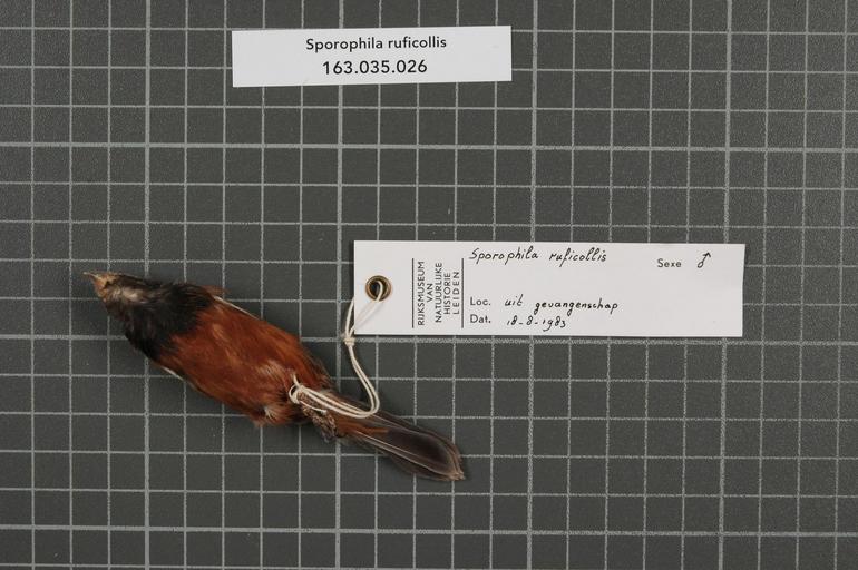 Keywords: Naturalis Biodiversity Center - RMNH.AVES.81906 2 - Sporophila ruficollis Cabanis, 1851 - Emberizidae - bird skin specimen.jpeg artwork Dimensions artwork Document type Emberizidae Sporophila Individual count 1 Infraspecific epithet Infraspecific rank Institution Naturalis Kind of unit artwork Kind of unit specimen skin Life stage Medium artwork Nomenclatural code Occurrence ID page Other fields Other versions artwork Permission license Naturalis donation CC-0 Publication location Scientific name Sporophila ruficollis Cabanis 1851 Scientific name authorship Cabanis 1851 male Source url http //bioportal naturalis nl Specific epithet ruficollis State or province Subject keywords artwork Subject keywords publication Title artwork Title publication Type status Uploaded with GWToolset Naturalis_Biodiversity_Center_-_RMNH AVES 81906_2_-_Sporophila_ruficollis_Cabanis _1851_-_Emberizidae_-_bird_skin_specimen http //medialib naturalis nl/file/id/RMNH AVES 81906_2/format/large Media donated by Naturalis Biodiversity Center Songbird specimens at Naturalis Biodiversity Center Sporophila ruficollis |
