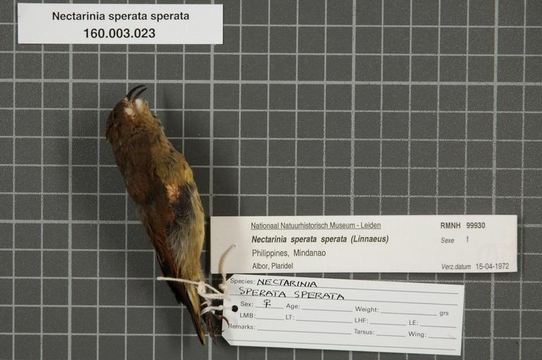 Keywords: Naturalis Biodiversity Center - RMNH.AVES.99930 1 - Nectarinia sperata sperata (Linnaeus, 1766) - Nectariniidae - bird skin specimen.jpeg artwork Dimensions artwork Document type Nectariniidae Nectarinia Individual count 1 Infraspecific epithet sperata Infraspecific rank Institution Naturalis Kind of unit artwork Kind of unit specimen skin Life stage Philippines Mindanao Id Surigao del Norte Plaridel Albor Medium artwork Nomenclatural code Occurrence ID page Other fields Other versions artwork Permission license Naturalis donation CC-0 Publication location Scientific name Nectarinia sperata sperata Linnaeus 1766 Scientific name authorship Linnaeus 1766 female Source url http //bioportal naturalis nl Specific epithet sperata State or province Subject keywords artwork Subject keywords publication Title artwork Title publication Type status Uploaded with GWToolset Naturalis_Biodiversity_Center_-_RMNH AVES 99930_1_-_Nectarinia_sperata_sperata_ Linnaeus _1766 _-_Nectariniidae_-_bird_skin_specimen http //medialib naturalis nl/file/id/RMNH AVES 99930_1/format/large Media donated by Naturalis Biodiversity Center Songbird specimens at Naturalis Biodiversity Center Leptocoma sperata |