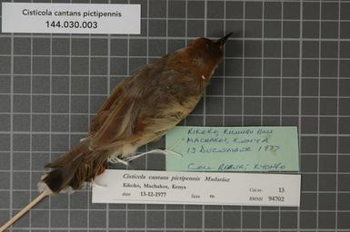 | Keywords: Naturalis Biodiversity Center - RMNH.AVES.94702 1 - Cisticola cantans pictipennis Madarász, 1904 - Sylviidae - bird skin specimen.jpeg artwork Dimensions artwork Document type Sylviidae Cisticola Individual count 1 Infraspecific epithet pictipennis Infraspecific rank Institution Naturalis Kind of unit artwork Kind of unit specimen skin Life stage Kenya Machakos Kilungu Hills Kikoko Medium artwork Nomenclatural code Occurrence ID page Other fields Other versions artwork Permission license Naturalis donation CC-0 Publication location Scientific name Cisticola cantans pictipennis Madarász 1904 Scientific name authorship Madarász 1904 male Source url http //bioportal naturalis nl Specific epithet cantans State or province Machakos Kilungu Hills Subject keywords artwork Subject keywords publication Title artwork Title publication Type status Uploaded with GWToolset Naturalis_Biodiversity_Center_-_RMNH AVES 94702_1_-_Cisticola_cantans_pictipennis_Madarász _1904_-_Sylviidae_-_bird_skin_specimen http //medialib naturalis nl/file/id/RMNH AVES 94702_1/format/large Media donated by Naturalis Biodiversity Center Songbird specimens at Naturalis Biodiversity Center Cisticola cantans museum specimens |