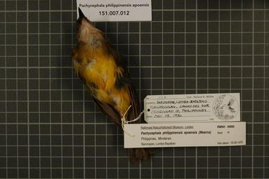 | Keywords: Naturalis Biodiversity Center - RMNH.AVES.99880 2 - Pachycephala philippinensis apoensis (Mearns, 1905) - Pachycephalidae - bird skin specimen.jpeg artwork Dimensions artwork Document type Pachycephalidae Pachycephala Individual count 1 Infraspecific epithet apoensis Infraspecific rank Institution Naturalis Kind of unit artwork Kind of unit specimen skin Life stage Philippines Mindanao Lanao del Sur Lumba-Bayabao Piagayungan Saronayan Medium artwork Nomenclatural code Occurrence ID page Other fields Other versions artwork Permission license Naturalis donation CC-0 Publication location Scientific name Pachycephala philippinensis apoensis Mearns 1905 Scientific name authorship Mearns 1905 male Source url http //bioportal naturalis nl Specific epithet philippinensis State or province Mindanao Lanao del Sur Lumba-Bayabao Subject keywords artwork Subject keywords publication Title artwork Title publication Type status Uploaded with GWToolset Naturalis_Biodiversity_Center_-_RMNH AVES 99880_2_-_Pachycephala_philippinensis_apoensis_ Mearns _1905 _-_Pachycephalidae_-_bird_skin_specimen http //medialib naturalis nl/file/id/RMNH AVES 99880_2/format/large Media donated by Naturalis Biodiversity Center Songbird specimens at Naturalis Biodiversity Center Pachycephala philippinensis apoensis |