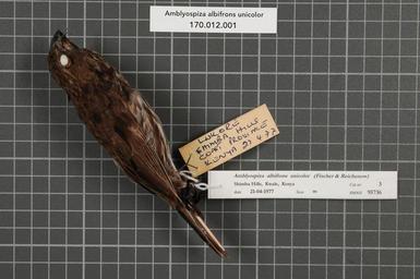 | Keywords: Naturalis Biodiversity Center - RMNH.AVES.95736 1 - Amblyospiza albifrons unicolor (Fischer and Reichenow, 1878) - Ploceidae - bird skin specimen.jpeg artwork Dimensions artwork Document type Ploceidae Amblyospiza Individual count 1 Infraspecific epithet unicolor Infraspecific rank Institution Naturalis Kind of unit artwork Kind of unit specimen skin Life stage Kenya Coast Province Kwale Shimba Hills Lukore Medium artwork Nomenclatural code Occurrence ID page Other fields Other versions artwork Permission license Naturalis donation CC-0 Publication location Scientific name Amblyospiza albifrons unicolor Fischer and Reichenow 1878 Scientific name authorship Fischer and Reichenow 1878 male Source url http //bioportal naturalis nl Specific epithet albifrons State or province Coast Province Kwale Shimba Hills Subject keywords artwork Subject keywords publication Title artwork Title publication Type status Uploaded with GWToolset Naturalis_Biodiversity_Center_-_RMNH AVES 95736_1_-_Amblyospiza_albifrons_unicolor_ Fischer_and_Reichenow _1878 _-_Ploceidae_-_bird_skin_specimen http //medialib naturalis nl/file/id/RMNH AVES 95736_1/format/large Media donated by Naturalis Biodiversity Center Songbird specimens at Naturalis Biodiversity Center Amblyospiza albifrons museum specimens |