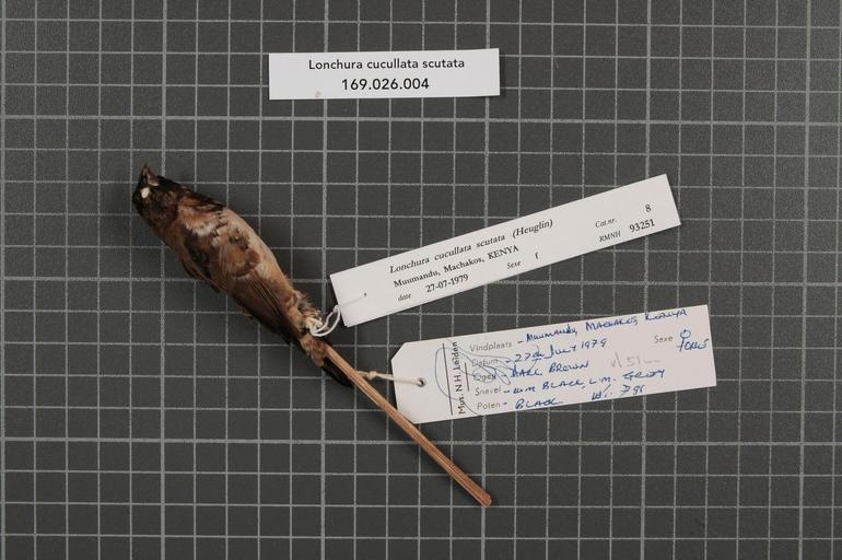 | Keywords: Naturalis Biodiversity Center - RMNH.AVES.93251 1 - Lonchura cucullata scutata (Heuglin, 1863) - Estrildidae - bird skin specimen.jpeg artwork Dimensions artwork Document type Estrildidae Lonchura Individual count 1 Infraspecific epithet scutata Infraspecific rank Institution Naturalis Kind of unit artwork Kind of unit specimen skin Life stage Kenya Machakos Muumandu Medium artwork Nomenclatural code Occurrence ID page Other fields Other versions artwork Permission license Naturalis donation CC-0 Publication location Scientific name Lonchura cucullata scutata Heuglin 1863 Scientific name authorship Heuglin 1863 Source url http //bioportal naturalis nl Specific epithet cucullata State or province Machakos Subject keywords artwork Subject keywords publication Title artwork Title publication Type status Uploaded with GWToolset Naturalis_Biodiversity_Center_-_RMNH AVES 93251_1_-_Lonchura_cucullata_scutata_ Heuglin _1863 _-_Estrildidae_-_bird_skin_specimen http //medialib naturalis nl/file/id/RMNH AVES 93251_1/format/large Media donated by Naturalis Biodiversity Center Songbird specimens at Naturalis Biodiversity Center Lonchura cucullata museum specimens |