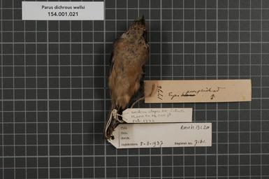 | Keywords: Naturalis Biodiversity Center - RMNH.AVES.131210 2 - Parus dichrous wellsi Baker, 1917 - Paridae - bird skin specimen.jpeg artwork Dimensions artwork Document type Paridae Parus Individual count 1 Infraspecific epithet wellsi Infraspecific rank Institution Naturalis Kind of unit artwork Kind of unit specimen skin Life stage Medium artwork Nomenclatural code General remarks unreadable chinese letters on label 3Locality remark western slopes Mt Satseto Occurrence ID page Other fields Other versions artwork Permission license Naturalis donation CC-0 Publication location Scientific name Parus dichrous wellsi Baker 1917 Scientific name authorship Baker 1917 male Source url http //bioportal naturalis nl Specific epithet dichrous State or province Yunnan Subject keywords artwork Subject keywords publication Title artwork Title publication Type status Uploaded with GWToolset Naturalis_Biodiversity_Center_-_RMNH AVES 131210_2_-_Parus_dichrous_wellsi_Baker _1917_-_Paridae_-_bird_skin_specimen http //medialib naturalis nl/file/id/RMNH AVES 131210_2/format/large Media donated by Naturalis Biodiversity Center Songbird specimens at Naturalis Biodiversity Center Lophophanes dichrous museum specimens |