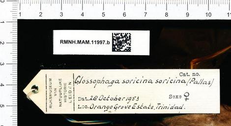 | Keywords: Naturalis Biodiversity Center - RMNH.MAM.11997.b gen - Glossophaga soricina soricina - skull.jpeg artwork Dimensions artwork Document type Glossophaga Individual count 1 Infraspecific epithet soricina Infraspecific rank Institution Naturalis Kind of unit artwork Kind of unit specimen skull Life stage Orange Grove Estate Trinidad Medium artwork Nomenclatural code Occurrence ID page Other fields Other versions artwork Permission license Naturalis donation CC-0 Publication location Scientific name Glossophaga soricina soricina Scientific name authorship female Source url http //bioportal naturalis nl Specific epithet soricina State or province Subject keywords artwork Subject keywords publication Title artwork Title publication Type status Uploaded with GWToolset Naturalis_Biodiversity_Center_-_RMNH MAM 11997 b_gen_-_Glossophaga_soricina_soricina_-_skull http //medialib naturalis nl/file/id/RMNH MAM 11997 b_gen/format/large Media donated by Naturalis Biodiversity Center Mammals at Naturalis from the Rijksmuseum van Natuurlijke Historie Glossophaga soricina |