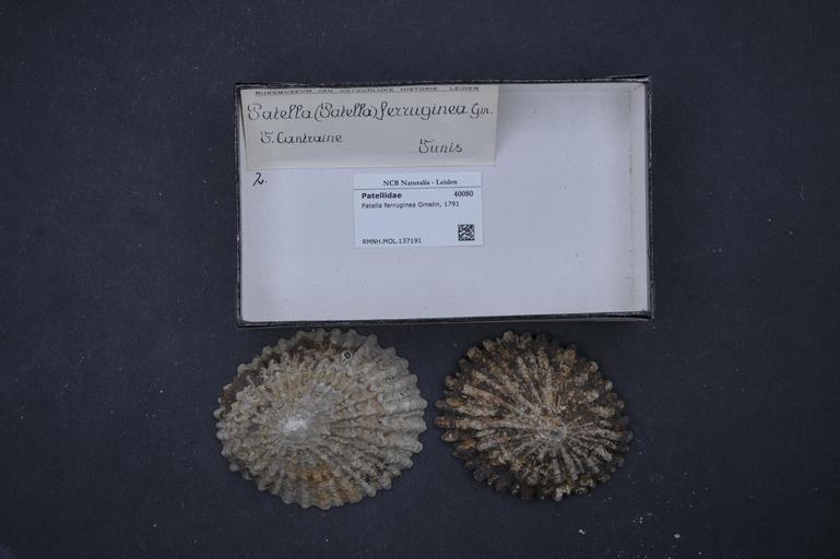 | Keywords: Naturalis Biodiversity Center - RMNH.MOL.137191 - Patella ferruginea Gmelin, 1791 - Patellidae - Mollusc shell.jpeg artwork Dimensions artwork Document type Patellidae subfamily Patellinae Patella Individual count Infraspecific epithet Infraspecific rank Institution Naturalis Kind of unit artwork Kind of unit specimen shell Life stage Medium artwork Nomenclatural code Source institute Leiden Scale the width of the text on the species/QR-code label is 38 mm Occurrence ID page Other fields Other versions artwork Permission license Naturalis donation CC-0 Mollusca Publication location Scientific name Patella ferruginea Gmelin 1791 Scientific name authorship Gmelin 1791 Source url http //bioportal naturalis nl Specific epithet ferruginea State or province Subject keywords artwork Subject keywords publication Title artwork Title publication Type status Uploaded with GWToolset Naturalis_Biodiversity_Center_-_RMNH MOL 137191_-_Patella_ferruginea_Gmelin _1791_-_Patellidae_-_Mollusc_shell http //medialib naturalis nl/file/id/RMNH MOL 137191/format/large Molluscs at Naturalis from the Rijksmuseum van Natuurlijke Historie Media donated by Naturalis Biodiversity Center Patella mollusc Patella ferruginea |
