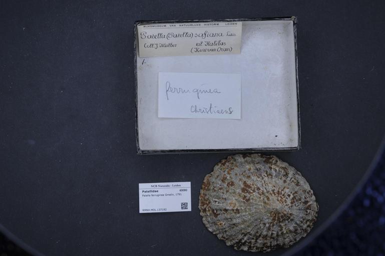 | Keywords: Naturalis Biodiversity Center - RMNH.MOL.137192 - Patella ferruginea Gmelin, 1791 - Patellidae - Mollusc shell.jpeg artwork Dimensions artwork Document type Patellidae subfamily Patellinae Patella Individual count Infraspecific epithet Infraspecific rank Institution Naturalis Kind of unit artwork Kind of unit specimen shell Life stage Medium artwork Nomenclatural code Source institute Leiden Scale the width of the text on the species/QR-code label is 38 mm Occurrence ID page Other fields Other versions artwork Permission license Naturalis donation CC-0 Mollusca Publication location Scientific name Patella ferruginea Gmelin 1791 Scientific name authorship Gmelin 1791 Source url http //bioportal naturalis nl Specific epithet ferruginea State or province Subject keywords artwork Subject keywords publication Title artwork Title publication Type status Uploaded with GWToolset Naturalis_Biodiversity_Center_-_RMNH MOL 137192_-_Patella_ferruginea_Gmelin _1791_-_Patellidae_-_Mollusc_shell http //medialib naturalis nl/file/id/RMNH MOL 137192/format/large Molluscs at Naturalis from the Rijksmuseum van Natuurlijke Historie Media donated by Naturalis Biodiversity Center Patella mollusc Patella ferruginea |