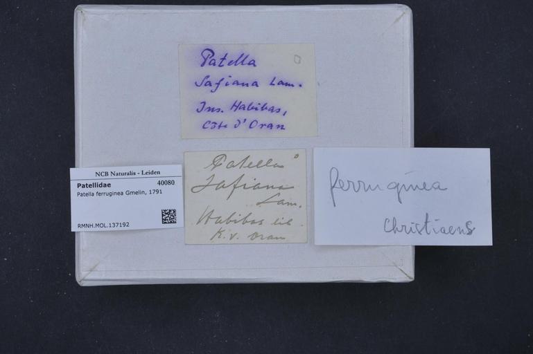 | Keywords: Naturalis Biodiversity Center - RMNH.MOL.137192 1 - Patella ferruginea Gmelin, 1791 - Patellidae - Mollusc shell.jpeg artwork Dimensions artwork Document type Patellidae subfamily Patellinae Patella Individual count Infraspecific epithet Infraspecific rank Institution Naturalis Kind of unit artwork Kind of unit specimen shell Life stage Medium artwork Nomenclatural code Source institute Leiden Scale the width of the text on the species/QR-code label is 38 mm Occurrence ID page Other fields Other versions artwork Permission license Naturalis donation CC-0 Mollusca Publication location Scientific name Patella ferruginea Gmelin 1791 Scientific name authorship Gmelin 1791 Source url http //bioportal naturalis nl Specific epithet ferruginea State or province Subject keywords artwork Subject keywords publication Title artwork Title publication Type status Uploaded with GWToolset Naturalis_Biodiversity_Center_-_RMNH MOL 137192_1_-_Patella_ferruginea_Gmelin _1791_-_Patellidae_-_Mollusc_shell http //medialib naturalis nl/file/id/RMNH MOL 137192_1/format/large Molluscs at Naturalis from the Rijksmuseum van Natuurlijke Historie Media donated by Naturalis Biodiversity Center Patella mollusc Patella ferruginea |