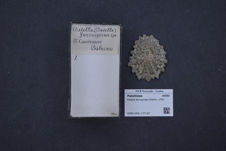 | Keywords: Naturalis Biodiversity Center - RMNH.MOL.137197 - Patella ferruginea Gmelin, 1791 - Patellidae - Mollusc shell.jpeg artwork Dimensions artwork Document type Patellidae subfamily Patellinae Patella Individual count Infraspecific epithet Infraspecific rank Institution Naturalis Kind of unit artwork Kind of unit specimen shell Life stage Medium artwork Nomenclatural code Source institute Leiden Scale the width of the text on the species/QR-code label is 38 mm Occurrence ID page Other fields Other versions artwork Permission license Naturalis donation CC-0 Mollusca Publication location Scientific name Patella ferruginea Gmelin 1791 Scientific name authorship Gmelin 1791 Source url http //bioportal naturalis nl Specific epithet ferruginea State or province Subject keywords artwork Subject keywords publication Title artwork Title publication Type status Uploaded with GWToolset Naturalis_Biodiversity_Center_-_RMNH MOL 137197_-_Patella_ferruginea_Gmelin _1791_-_Patellidae_-_Mollusc_shell http //medialib naturalis nl/file/id/RMNH MOL 137197/format/large Molluscs at Naturalis from the Rijksmuseum van Natuurlijke Historie Media donated by Naturalis Biodiversity Center Patella mollusc Patella ferruginea |
