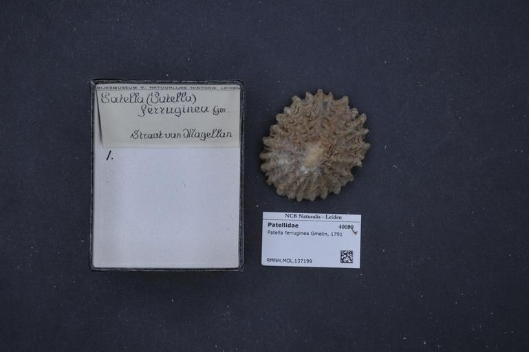 | Keywords: Naturalis Biodiversity Center - RMNH.MOL.137199 - Patella ferruginea Gmelin, 1791 - Patellidae - Mollusc shell.jpeg artwork Dimensions artwork Document type Patellidae subfamily Patellinae Patella Individual count Infraspecific epithet Infraspecific rank Institution Naturalis Kind of unit artwork Kind of unit specimen shell Life stage Medium artwork Nomenclatural code Source institute Leiden Scale the width of the text on the species/QR-code label is 38 mm Occurrence ID page Other fields Other versions artwork Permission license Naturalis donation CC-0 Mollusca Publication location Scientific name Patella ferruginea Gmelin 1791 Scientific name authorship Gmelin 1791 Source url http //bioportal naturalis nl Specific epithet ferruginea State or province Subject keywords artwork Subject keywords publication Title artwork Title publication Type status Uploaded with GWToolset Naturalis_Biodiversity_Center_-_RMNH MOL 137199_-_Patella_ferruginea_Gmelin _1791_-_Patellidae_-_Mollusc_shell http //medialib naturalis nl/file/id/RMNH MOL 137199/format/large Molluscs at Naturalis from the Rijksmuseum van Natuurlijke Historie Media donated by Naturalis Biodiversity Center Patella mollusc Patella ferruginea |