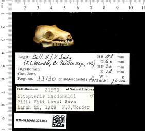 | Keywords: Naturalis Biodiversity Center - RMNH.MAM.33130.a lat - Notopteris macdonaldi - skull.jpeg artwork Dimensions artwork Document type Notopteris Individual count 1 Infraspecific epithet Infraspecific rank Institution Naturalis Kind of unit artwork Kind of unit specimen skull Life stage Colombo Cave Suva Viti Levu Fiji Eil Medium artwork Nomenclatural code Occurrence ID page Other fields Other versions artwork Permission license Naturalis donation CC-0 Publication location Scientific name Notopteris macdonaldi Scientific name authorship male Source url http //bioportal naturalis nl Specific epithet macdonaldi State or province Subject keywords artwork Subject keywords publication Title artwork Title publication Type status Uploaded with GWToolset Naturalis_Biodiversity_Center_-_RMNH MAM 33130 a_lat_-_Notopteris_macdonaldi_-_skull http //medialib naturalis nl/file/id/RMNH MAM 33130 a_lat/format/large Media donated by Naturalis Biodiversity Center Mammals at Naturalis from the Rijksmuseum van Natuurlijke Historie Notopteris macdonaldi Notopteris |