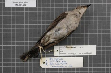 | Keywords: Naturalis Biodiversity Center - RMNH.AVES.68698 2 - Mimus gilvus gilvus (Vieillot, 1808) - Mimidae - bird skin specimen.jpeg artwork Dimensions artwork Document type Mimidae Mimus Individual count 1 Infraspecific epithet gilvus Infraspecific rank Institution Naturalis Kind of unit artwork Kind of unit specimen skin Life stage Suriname Zanderij Medium artwork Nomenclatural code Occurrence ID page Other fields Other versions artwork Permission license Naturalis donation CC-0 Publication location Scientific name Mimus gilvus gilvus Vieillot 1808 Scientific name authorship Vieillot 1808 female Source url http //bioportal naturalis nl Specific epithet gilvus State or province Subject keywords artwork Subject keywords publication Title artwork Title publication Type status Uploaded with GWToolset Naturalis_Biodiversity_Center_-_RMNH AVES 68698_2_-_Mimus_gilvus_gilvus_ Vieillot _1808 _-_Mimidae_-_bird_skin_specimen http //medialib naturalis nl/file/id/RMNH AVES 68698_2/format/large Media donated by Naturalis Biodiversity Center Songbird specimens at Naturalis Biodiversity Center Mimus gilvus museum specimens |