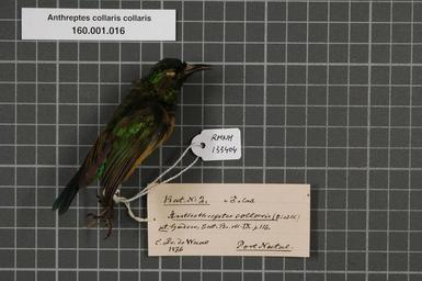 | Keywords: Naturalis Biodiversity Center - RMNH.AVES.133404 1 - Anthreptes collaris collaris (Vieillot, 1819) - Nectariniidae - bird skin specimen.jpeg artwork Dimensions artwork Document type Nectariniidae Anthreptes Individual count 1 Infraspecific epithet collaris Infraspecific rank Institution Naturalis Kind of unit artwork Kind of unit specimen skin Life stage Port Natal Medium artwork Nomenclatural code Sex remark On Finsch -label male lab Occurrence ID page Other fields Other versions artwork Permission license Naturalis donation CC-0 Publication location Scientific name Anthreptes collaris collaris Vieillot 1819 Scientific name authorship Vieillot 1819 male Source url http //bioportal naturalis nl Specific epithet collaris State or province Subject keywords artwork Subject keywords publication Title artwork Title publication Type status Uploaded with GWToolset Naturalis_Biodiversity_Center_-_RMNH AVES 133404_1_-_Anthreptes_collaris_collaris_ Vieillot _1819 _-_Nectariniidae_-_bird_skin_specimen http //medialib naturalis nl/file/id/RMNH AVES 133404_1/format/large Media donated by Naturalis Biodiversity Center Songbird specimens at Naturalis Biodiversity Center Hedydipna collaris Anthreptes |
